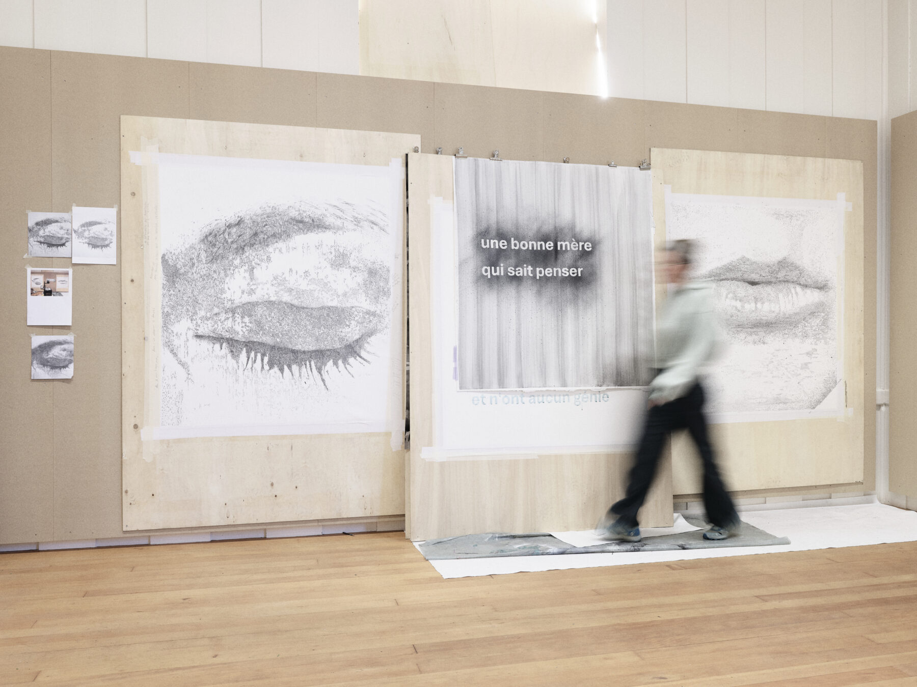 Depuis 2015, la pratique artistique de Noémie Doge est centrée sur le médium du dessin, notamment de grands formats au graphite. Ses œuvres sont caractérisées par la précision et par la composition de formes et de fragments projetés, dont émergent des images potentielles susceptibles d’entrer en résonance avec l’inconscient. Son travail articule des éléments issus de son expérience personnelle et intime avec des enjeux sociétaux contemporains, notamment la maternité, l’écologie et le féminisme, qui constituent des axes centraux de sa démarche artistique.